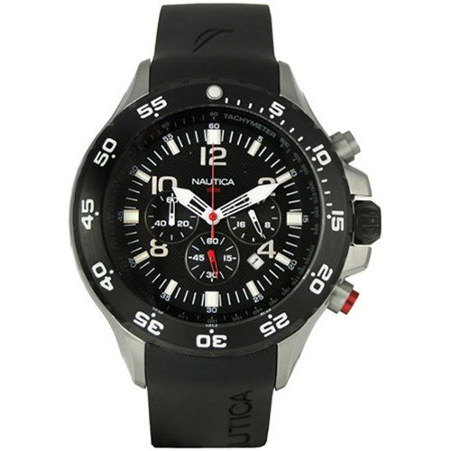 | The Nautica Men's NST Chronograph Watch features three unique subdials for enhanced utility. Constructed with a stainless steel case, the timepiece includes a unidirectional silver-tone bezel with white Arabic minute indexes and a black resin wristband with an adjustable buckle clasp. A tough mineral window shields the black dial, which features bold white Arabic numeral indexes at even intervals. The hour markers are capped with white Arabic numeral indexes that clock the minutes in increments of five. The dial is encircled by a gray tachymeter and includes white minute indexes, a date calendar at four o'clock, and three white chronograph subdials. Powered by analog-quartz movement, the watch is water resistant to 330 feet. ...Read more |